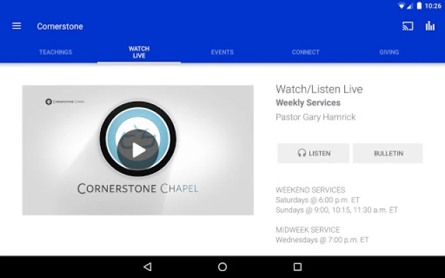 Download the Cornerstone Chapel mobile app to view our weekly services streamed live to your mobile device, access recent teachings, read about upcoming events, and more!