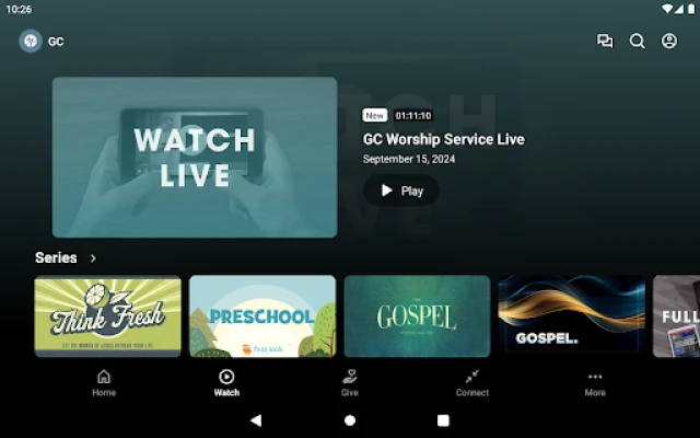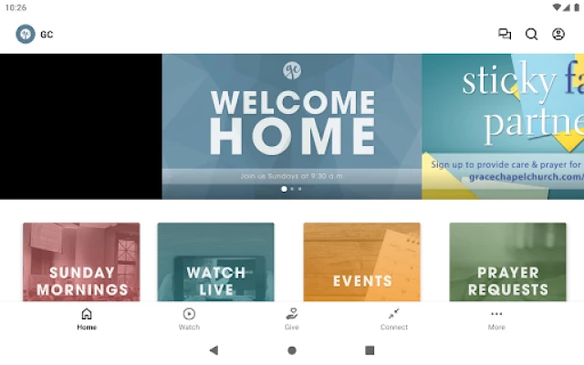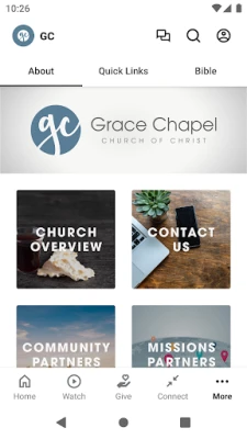 FEATURES - Stream GC worship services and messages - Learn about events happening at Grace Chapel - Quick, easy access to online giving - Send prayer requests any time - View exclusive video content for kids - Premium content, such as "The Chosen," "The Bible Project," and more!