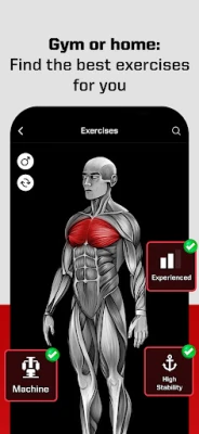 1️⃣ Super easy with great visuals! Just tap on the muscle group you want to train, and the best exercises will be listed. You can explore 23 different muscle regions based on bodybuilding anatomy!